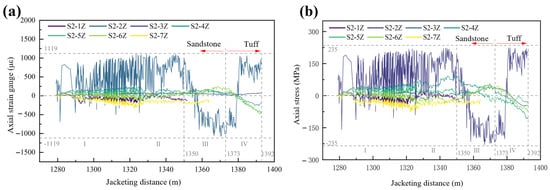 The axial strain and stress at various measurement points along the S2 monitoring section with jacking distance are shown in Figure 9. Again, for ease of description, the entire monitoring section is divided into four stages based on the curve changes: Stage I (1279 m~1321 m), Stage II (1321 m~1350 m), Stage III (1350 m~1373 m), and Stage IV (1373 m~1392 m).