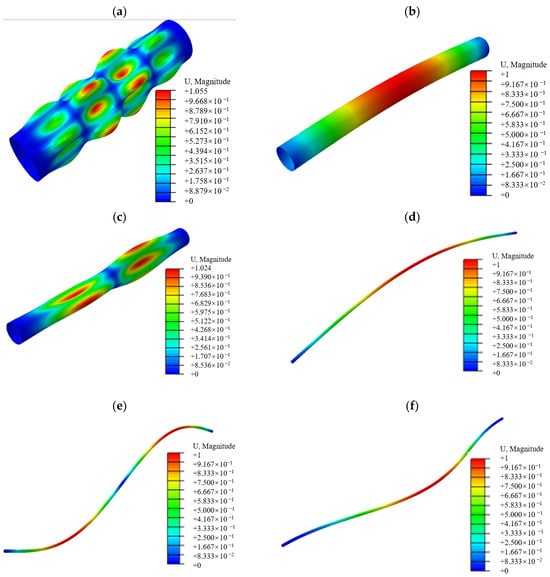 Buckling modes of steel tubes of different lengths. (a) First-order buckling mode of an 8 m short pipe; for 20 m medium pipe at (b) first-order buckling mode and (c) second-order buckling mode; for 207 m long pipe at (d) first-order buckling mode (e) second-order buckling mode and (f) third-order buckling mode.