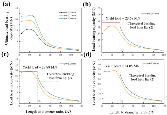 (a) Variation of ultimate bearing capacity with length-to-diameter ratio, L/D, and the ultimate bearing capacity at different wall thicknesses (t) for (b) t = 0.018 mm, (c) t = 0.022 mm, and (d) t = 0.026 mm. The blue curve is obtained by using the theoretical model, e.g., Equation (2), which is valid for L/D greater than 35.1.