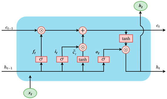 LSTM, a variant of RNNs, addresses the vanishing gradient problem by incorporating a gating mechanism [52]. Figure 1 depicts the architecture of an LSTM. At each time step t, the LSTM layer retains a hidden memory cell along with three gating mechanisms (i.e., input gate, forget gate, and output gate). The LSTM cell takes the current input xt, the previous output ht−1, and the previous cell state ct−1 as inputs. These gates work together to update or discard information. The input, forget, and output gates, along with the LSTM memory cell, are expressed as follows: