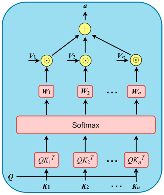 The attention mechanism [53] is a specialized architecture integrated into machine learning models that automatically determines the contribution of each input to the output. This facilitates decision-making from large datasets, reducing the computation costs, and enhances both learning efficiency and accuracy. The attention mechanism serves as an advancement to the encoder–decoder architecture by focusing on and accumulating information from inputs at each time step, thereby building a more effective memory representation. The framework of the scaled dot-product attention is described in Figure 2. To implement the attention mechanism, the raw input data are expressed as ⟨key,value⟩ pairs, and the similarity coefficient between the Key and the Query can be computed. The corresponding weight coefficient for the Value can be obtained using the Query from the specified task within the target. The weight coefficient W is then multiplied by the Value to produce the output a. When Query, Key, and Value are, respectively, denoted by Q, K, and V, the formulas for calculating W and a can be expressed as follows: