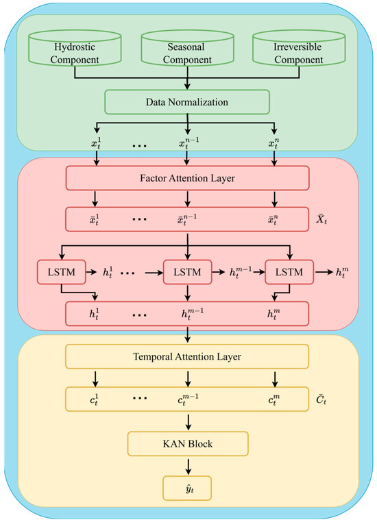 This study introduces a hybrid model that merges LSTM and KAN, leveraging the ability of LSTM to process sequential data and the ability of KANs in capturing complex nonlinear relationships. During the initialization of the model, the LSTM layer is established, and the KAN model is innovatively incorporated as a subsequent processing layer for the output of the LSTM, replacing the traditional fully connected layer. In the forward propagation function, the final hidden state of the LSTM serves as the input to the KAN layer. Additionally, both a factor attention mechanism and a temporal attention mechanism (i.e., a dual-stage attention mechanism) are introduced into the LSTM network, where the LSTM serves as both encoder and decoder [39]. The factor attention mechanism is devised to adaptively identify the most influential factors at each time step. Furthermore, the temporal attention mechanism accurately extracts crucial time segments by identifying the relevant hidden states across all time steps [54]. The proposed LSTM-KAN network, featuring a dual-stage attention mechanism, is named DA-LSTM-KAN and is specifically designed for predicting concrete dam displacement. Figure 3 illustrates the overall architecture of the DA-LSTM-KAN model.