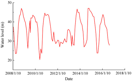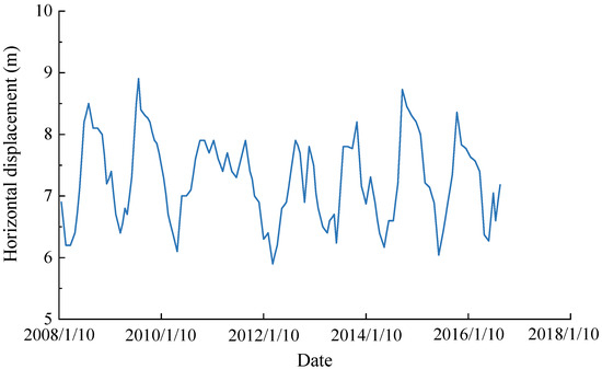 The effectiveness of the proposed DA-LSTM-KAN was validated through its application to a concrete gravity dam located on the Minjiang River in Fujian Province, China. The dam consists of 21 dam sections, and the maximum dam height is 71.0 m. Horizontal displacement monitoring data along the river were selected and analyzed from a measurement point on the No. 12 dam section (Figure 4). Due to the lack of thermometer monitoring data, the input environmental variables included the reservoir water levels and the annual and semiannual harmonic variations recorded from the start of the monitoring to the survey date. The time series of the reservoir level is shown in Figure 5. The variation in horizontal displacement is presented in Figure 6. Note that the monitoring data of the measurement points selected in this case were relatively complete. However, when there are missing data or abnormal data, it becomes imperative to adopt cluster analysis [55], mode decomposition [56], transfer learning [57], and other data processing and reconstruction techniques prior to establishing the monitoring model.