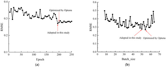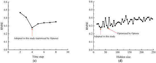 In order to further quantify the influence of hyperparameters on the model output, Figure 7a–d show the relationships between the performance of the LSTM model and epoch, batch size, time step, and hidden size. The hyperparameters used in this paper and those optimized by an automated method called OPTUNA [58] are marked in the figure. The results indicate that hyperparameter selection does have a certain impact on the model performance, and the hyperparameters in Table 1 closely align with those obtained through OPTUNA optimization, leading to favorable model outcomes. However, as hyperparameter optimization is not the focus of this paper, it will not be discussed further.
