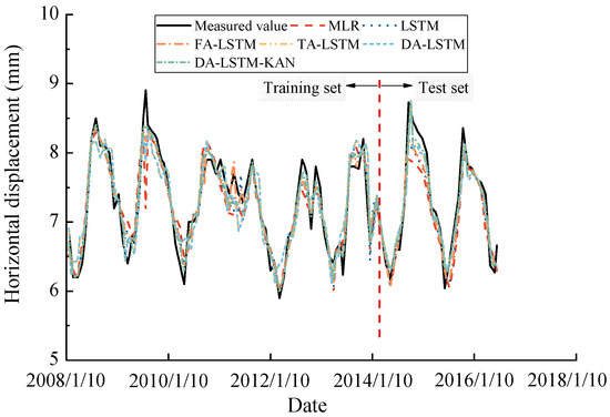 This section provides a comprehensive overview of the prediction results, aiming to assess and compare the performance of baseline models with that of the proposed model. To visually demonstrate predictive performance, Figure 8 presents the predicted displacements from different models alongside the measured displacements from the training and test sets at the measurement point. The figure shows that the DA-LSTM-KAN model predicted the measured data better than other models. The prediction accuracies on the training and test sets of all models are shown in Table 2. The table indicates that the proposed model outperformed all comparative models across all four performance metrics. Among the models evaluated, the MLR model showed the weakest performance, while the LSTM-based model with attention achieved better results than the model that relied solely on LSTM. Compared to DA-LSTM, the elevated predictive power of DA-LSTM-KAN is potentially attributed to the replacement of the fully connected layer processing the LSTM output with the KAN. In order to further verify the robustness of the proposed model, we split the data into training and test sets in an 8:2 ratio and compared all models again. The results, shown in Table 3, indicated that the DA-LSTM-KAN model performed well across all four metrics compared to the other models. In the subsequent analyses, we reverted to the original data split in a 7:3 ratio for consistency.