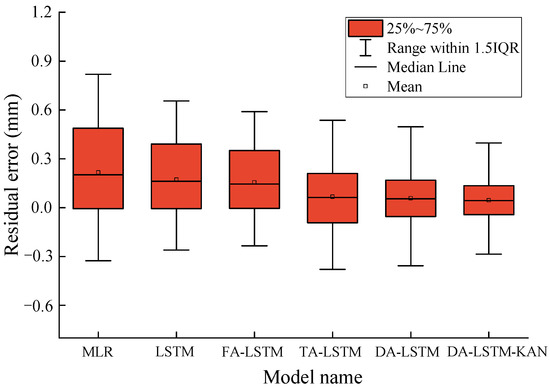 To gain deeper insights into the method’s effectiveness, residual box plots were utilized to compare the predictive performance across different models. The results of these residual box plots are displayed in Figure 9. It is evident from the figure that the proposed method exhibited significantly lower volatility in deformation prediction compared to the other comparison methods. Meanwhile, the residuals were more concentrated for DA-LSTM-KAN, indicating superior deformation prediction performance. Additionally, the model incorporating solely the factor attention mechanism (i.e., FA-LSTM) exhibited a slightly lower predictive performance compared to the models utilizing only the temporal attention mechanism (i.e., TA-LSTM) as well as the models integrating both temporal and factor attention mechanisms (i.e., DA-LSTM).