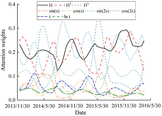 Furthermore, the performance of the proposed model was compared with those of multiple linear regression (MLR), LSTM, LSTM with only a factor attention mechanism (FA-LSTM), LSTM with only a temporal attention mechanism (TA-LSTM), and LSTM with a dual-stage attention mechanism (DA-LSTM), using the monitoring data from a period of 3019 days, from 10 January 2008 to 20 April 2016. All the models were trained with the same training set and verified with the same test set. The input variables for all models were selected as x = {x1, x2, …, x8, x9} = {H1, H2, H3, sin(s), cos(s), sin2(s), cos2(s), t, lnt}, where s = 2πt/365.