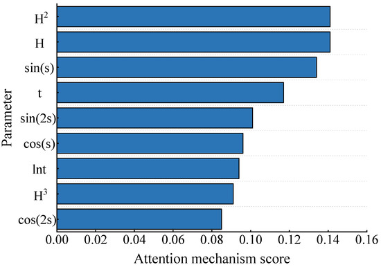 The attention mechanism automatically enables a model to focus on the most significant factors along the time dimension. Figure 10 is the visualization of the temporal attention weights of each factor of the DA-LSTM-KAN model. Among the nine input factors, the weights of the hydrostatic and seasonal factors were relatively larger, while the weights of irreversible factors were relatively smaller. Figure 11 shows the average attention weight of each factor derived from Figure 10. SHAP, introduced by Lundberg and Lee [59], offers a unified approach to interpreting machine learning models. This framework interprets each feature as a contributor to the model, quantifying its average marginal contribution to ascertain its influence on the model’s output. In order to further validate the attention mechanism’s ability to enhance model interpretability, we conducted a feature importance analysis of the LSTM black box model using SHAP, and the results are shown in Figure 12. From Figure 11 and Figure 12, it becomes evident that despite some discrepancies, the feature importance rankings derived from both methods exhibit a significant degree of similarity. In particular, two of the first three important features involve two hydrostatic components (i.e., x1 = H and x2 = H2), while at least one irreversible component is included in the least significant three variables.