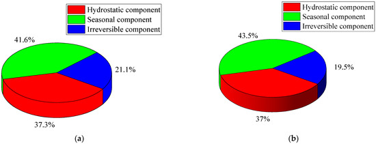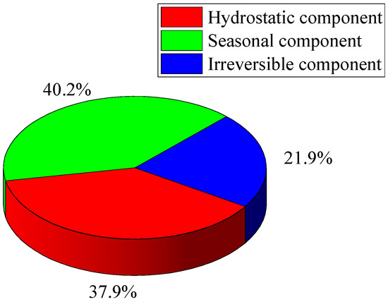 Figure 13a,b show the average attention weights (or average importance value) of the hydrostatic, seasonal, and time-dependent irreversible components for DA-LSTM-KAN and LSTM-SHAP, respectively. It is encouraging to note that the quantitative results for three components obtained through the two methods exhibit a high degree of consistency. Specifically, the figure indicates that the seasonal component is the largest contributor to displacement, with a contribution of 41.6% for DA-LSTM-KAN and 43.5% for LSTM-SHAP. The hydrostatic component follows, accounting for 37.3% of the displacement in DA-LSTM-KAN and 37.0% in LSTM-SHAP. Lastly, the irreversible component contributes 21.1% of the displacement for DA-LSTM-KAN and 19.5% for LSTM-SHAP. Multiple linear regression (MLR) models often stand out as the most straightforward approach, offering inherent interpretability. For a more comprehensive comparison, Figure 14 displays the process lines of each component at the measurement point using the traditional MLR model, while Figure 15 illustrates the relative importance of each component as determined by the relative weight method [60]. In this method, the relative weight of each variable represents the proportion of the predictable variance it accounts for. As shown in Figure 14 and Figure 15, the importance ranking of the three components derived from MLR aligns with that identified by DA-LSTM-KAN. Furthermore, the attention and relative weight techniques offer a more intuitive evaluation than the process line method, particularly when two components have similar levels of importance.