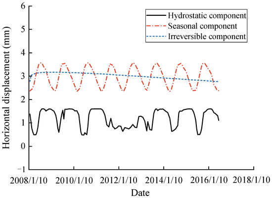 In the classic HST model expressed in Equation (1), dam displacement δ(H, S, T) is segmented into three distinct components: the hydrostatic component δ(H), which accounts for the effects of reservoir water; the seasonal component δ(S), associated with temperature variations; and the irreversible component δ(T), encompassing factors such as heat of hydration dissipation, creep, and alkali–aggregate reactions.