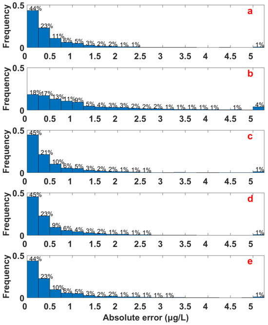 Further analysis demonstrated how the absence of various parameters affected the LSTM model’s accuracy in forecasting algal blooms. With complete data, 67% of forecasts had an absolute error below 0.5 μg/L, and only 1% had an error exceeding 5 μg/L (Figure 5a, Table 1). When Chl data were missing, the accuracy decreased significantly: the probability of an absolute error below 0.5 μg/L decreased to 36%, while the probability of an error exceeding 5 μg/L increased to 4% (Figure 5b, Table 1). Conversely, missing DO, Temp, and pH parameters did not significantly alter the distribution of absolute errors (Figure 5c–e), suggesting that Chl is the most critical factor for maintaining high prediction accuracy in the LSTM model.