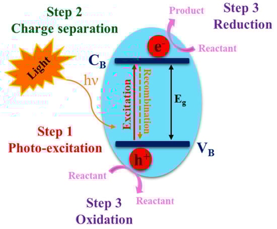 In the photocatalytic processes, the intensity and wavelength of light, as well as the irradiation time, play important roles. The light intensity affects the catalytic reaction rate by enhancing the excitation of the photocatalyst and generation of electron–hole pairs. Additionally, the wavelength of irradiation can affect the electronic and optical properties of the catalyst, some catalysts requiring UV irradiation while others functioning using visible light [65]. Accordingly, the bandgap energy is an important parameter that needs to be determined and reported for each developed photocatalyst.
