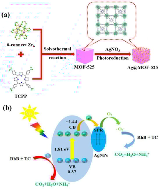 (a) The synthetic route of composite catalyst Ag@MOF-525 and (b) diagram of the degradation process. Adapted with permission from [72]. Copyright 2023 Elsevier.