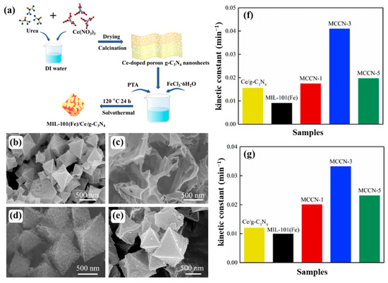 (a) Schematic illustration for synthesis of composite material; SEM images of (b) MIL-101(Fe); (c) Ce/g-C3N4; (d) MCCN-3; (e) MCCN-5; and (f,g) kinetics study of catalysts for elimination of RhB and MB, respectively. Adapted with permission from [90]. Copyright 2023 Elsevier.