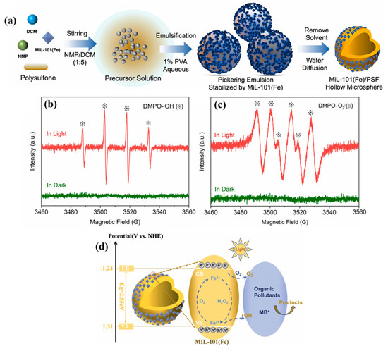 The composition of polymers with MOFs has attracted significant attention because of synergistic advantages that include higher stability, activated functionalities, and improved catalytic efficiency. Wang et al. prepared MIL-101(Fe)/polysulfone (MP) composite material with the Pickering emulsion template technique (Figure 6a). UV-DRS spectra showed bandgaps of 2.62 eV for MIL-101(Fe), 3.76 eV for polysulfone (PSF), and 2.55 eV for MP-0.56. SEM images revealed homogeneous hollow microsphere composite materials. The MP-0.56 composite material achieved 100% removal of MB in 60 min under visible light, outperforming the pure materials. The porosity and electrostatic interaction between dye molecules and PSF resulted in improved photocatalytic activity of the composite materials. Trapping experiments and ESR analyses confirmed that •OH and •O2− species were critical in the catalytic process (Figure 6b,c). MP-0.56 maintained a removal efficiency of 91% after five cycles [100]. The suggested mechanism for the photocatalytic reaction using MIL-101(Fe)/ PSF is inserted in Figure 6d.