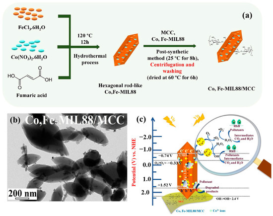 (a) Synthetic scheme of Co, Fe-MIL88/MCC; (b) TEM image of Co, Fe-MIL88/MCC; and (c) illustration of the photocatalytic reaction mechanism for the composite material. Adapted with permission from [103]. Copyright 2023 Elsevier.