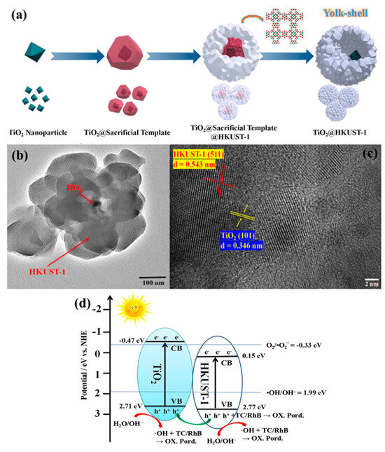 Light absorption in semiconductors generates electron–hole pairs that enable separated oxidation and reduction of pollutants on their surface [92]. Metal oxides are suitable catalysts for wastewater remediation because of their photostability, effective charge carrier transfer, low cost, and efficient photocatalytic performance. Roy et al. synthesized ZnO@HKUST-1 composite material with a chemical precipitation method and further calcination. The bandgaps of HKUST-1, ZnO, and ZnO@HKUST-1 were 3.2 eV, 3.1 eV, and 2.72 eV, respectively. SEM images revealed that the octahedral shape of the HKUST-1 remained intact in the nanocomposite material. The composite material exhibited an excellent efficiency of 97.4% in 45 min for Rose Bengal (RB) degradation under sunlight. Scavenger tests demonstrated that •OH and •O2− were the active species for this reaction. The nanocomposite displayed good reusability for up to five cycles, with an efficiency of >89%[67]. A novel TiO2@HKUST-1 nanoreactor was prepared, as shown in Figure 8a. SEM images of HKUST-1 showed an octahedral form, while for the TiO2@HKUST-1 nanoreactor, a yolk–shell morphology with a decrease in particle size of HKUST-1 was observed. TEM and HRTEM images of the TiO2@HKUST-1 confirmed the formation of the shell with HKUST-1 (Figure 8b). HRTEM images revealed lattice stripes of 0.346 nm and 0.543 nm, corresponding to the (511) plane of HKUST-1 and the (101) plane of anatase TiO2, respectively (Figure 8c). TiO2@HKUST-1 showed better photocatalytic performance than bare materials. It could degrade RhB and TC with an efficiency of 95.2% and 92.40% in 60 min under visible light radiation. The suggested mechanism is shown in Figure 8d. ESR and density function theory (DFT) calculations indicated h+ and •OH as the main active species. The photocatalytic performance of composite material reached 89.0 % after five cycles [105].