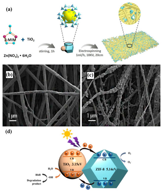 Cen et al. developed ZIF-8/TiO2 nanofibers comprised of TiO2 nanoparticles and ZIF-8, as illustrated in Figure 9a. SEM images showed that ZIF-8/TiO2 nanofibers contained plenty of nanoparticles on the surface and within the nanofibers (Figure 9b,c). The ZIF-8/TiO2 NFs-10 degraded 95.4% of RhB molecules under UV light irradiation in 240 min. Its photodegradation mechanism is illustrated in Figure 9d. According to trapping experiments, •OH was identified as the primary reactive species, aided by •O2− and h+ [25].