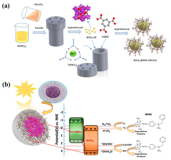 Bismuth oxide (Bi2O3) is a visible light-activated photocatalyst with a short bandgap and high oxidizing ability. Sharma et al. prepared Bi2O3@Fe-SA composite materials using Bi2O3 and Fe-SA (iron succinic acid organic frameworks) by a hydrothermal approach. The bandgaps of Bi2O3, Fe-SA, and Bi2O3@Fe-SA (1) were calculated to be 2.99 eV, 1.66 eV, and 1.55 eV, respectively. Bi2O3@Fe-SA (1) (molar ratios of Fe: Bi = 1:0.1) revealed the highest efficiency of 80% for the decomposition of RhB within 120 min under visible light. Trapping experiments indicated •OH as the main species in this reaction. Bi2O3@Fe-SA (1) maintained its efficiency after four catalytic cycles [80]. BaTiO3@ZIF-8 (Z/BTO) nanocomposites were synthesized by growing ZIF-8 on the BaTiO3 surface. The Z/BTO-25 (with a 25% loading ratio of BTO NPs) had a bandgap of 3.1 eV. BaTiO3@ZIF-8-25 degraded 93% of MB in 180 min and 100% of CR in 75 min under solar light. Trapping experiments revealed that the superoxide anion radicals and hydroxyl radicals are the important species in the photocatalytic reaction. The composite material exhibited good cyclability and maintained its performance over four cycles [24]. Hekmat et al. synthesized bismuth vanadate (BiVO4) using a hydrothermal method with 1-ethyl-3-methylimidazolium ethyl sulfate [Emim][EtSO4] ionic liquids (IL-2). The photocatalytic efficiency of BiVO4 was enhanced by growing MIL-100(Fe) on its surface to form BiVO4-MIL-100(Fe) composite material. Figure 10a shows the synthesis scheme of IL-BiVO4-MIL-100(Fe) composite material. It showed a reduced recombination rate, according to PL spectra. The composite material outperformed bare BiVO4, degrading 90% of Basic Red 46 (BR46) in 120 min under visible light. The mechanism of photocatalytic reaction with composite material is inserted in Figure 10b. Scavenger experiments indicated that •O2− and holes were crucial in the photocatalytic process [79].
