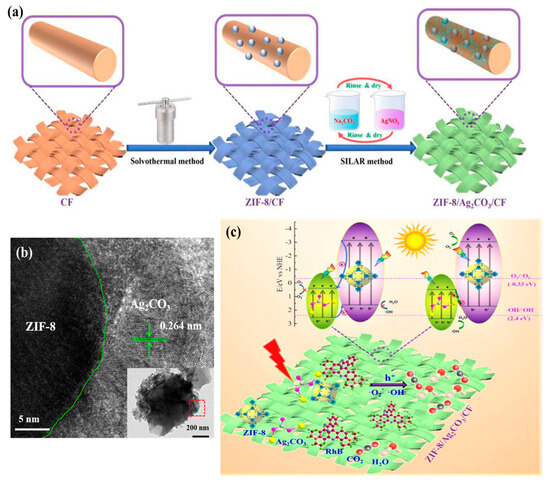 (a) Fabrication of photocatalytic cotton fabrics functionalized with ZIF-8/Ag2CO3 composite material; (b) HRTEM images of ZIF-8/Ag2CO3 /CF-10; and (c) proposed photocatalytic mechanism of ZIF-8/Ag2CO3/CF for dye degradation. Adapted with permission from [108]. Copyright 2023 Elsevier.