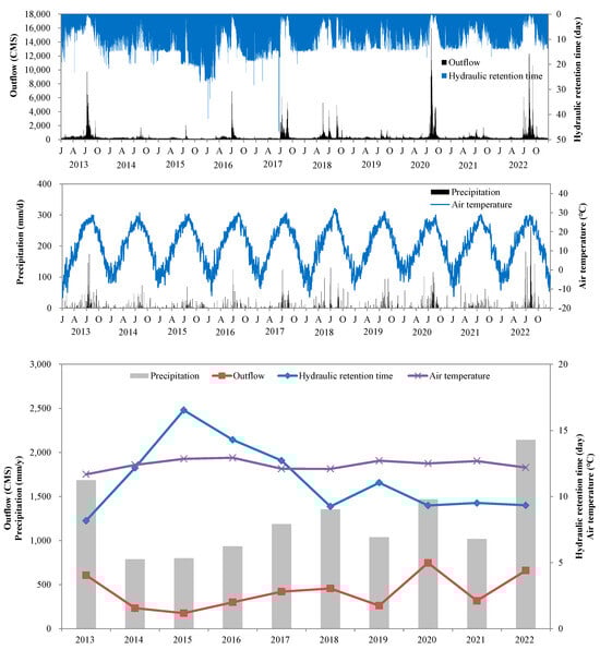 Yearly fluctuations of discharge, hydraulic retention time, precipitation and air temperature in Lake Paldang from 2013 to 2022.