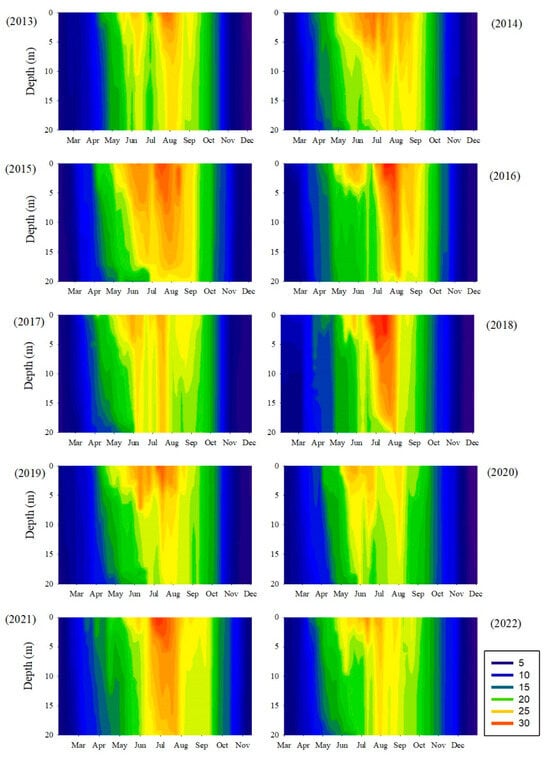Depth–time isopleths for water temperature (°C) in Lake Paldang.
