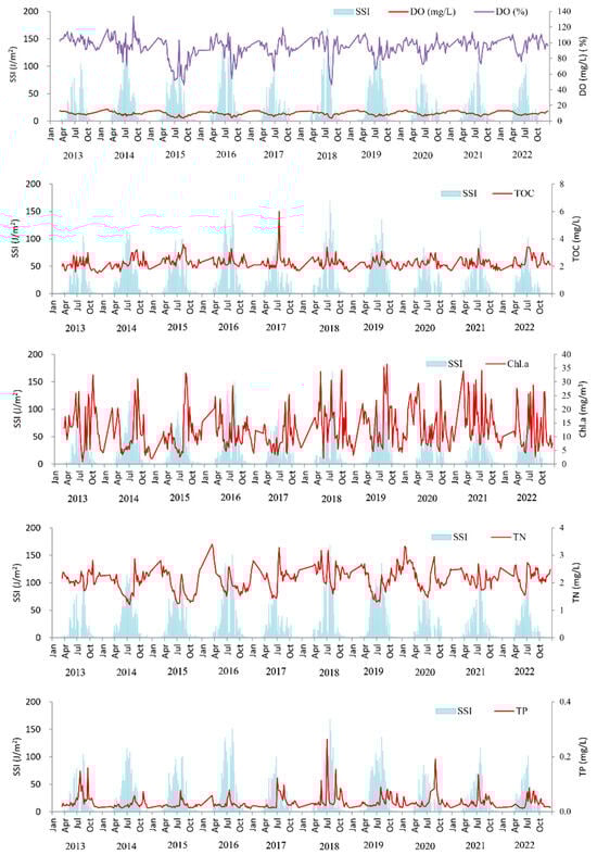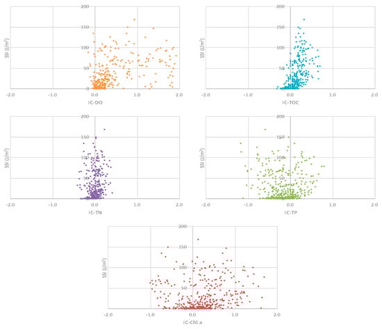 The hourly SSI and the concentration of each water quality parameter are shown in Figure 5 and Figure 8. The correlation between SSI and water quality parameters was analyzed (Table 4, Figure 9). The annual DO concentration decreased in summer and increased again in fall and winter. As SSI increased, DO (r = −0.508, p < 0.01, n = 424) decreased, while IC-DO (r = 0.531, p < 0.01, n = 424) increased. In spring and fall–winter, rising air temperatures increased surface water temperatures, leading to a density difference with deep water, which increased SSI. As surface water temperatures rose, oxygen saturation decreased, resulting in lower surface DO. Contrastingly, in summer, as air temperatures rose, surface DO increases due to active photosynthesis by surface algae. However, in deep waters, oxygen was consumed due to the decomposition of organic matter in the water and sediment, and the increased SSI restricted vertical mixing, making it difficult for atmospheric oxygen to reach the deep water, causing a decline in deep DO (r = −0.571, p < 0.05, n = 424) [8,48,49,50]. Additionally, the faster decomposition rates caused by high water temperatures during this period likely contributed to the decrease in deep DO [51]. Thus, in summer, surface DO increases while deep DO decreases, leading to an increase in IC-DO.