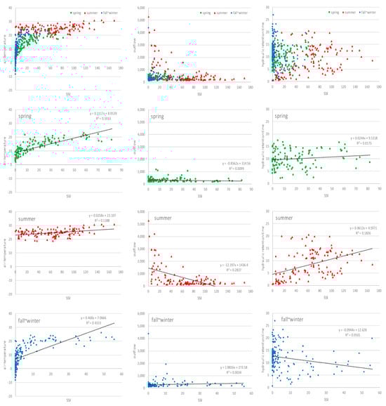 The annual average rainfall was 1243 mm, with significant year-to-year differences, ranging from below 1000 to 2143 mm in 2014–2016 (790 mm to 936 mm) and 2022 (p < 0.05), respectively. Daily rainfall (excluding no-rain days) ranged from 0.1 to 261.9 mm/day, with an average of 11.7 mm/day. The number of rainy days per year ranged from 84 (2016) to 128 (2013) days, with an average of 106 days. Rainfall increased in summer, with 81% of the annual rainfall concentrated in summer in 2017, whereas in 2021, seasonal rainfall was distributed more evenly: 34%, 38%, and 25% in spring, summer, and fall–winter, respectively, showing different seasonal rainfall patterns each year. Countries like South Korea, which are in the mid-latitude temperate zone, have four distinct seasons with rainfall concentrated in summer. However, due to abnormal weather and climate change, the annual variation in rainfall has increased nationwide, with greater rainfall intensity leading to more frequent and severe floods and droughts [37].