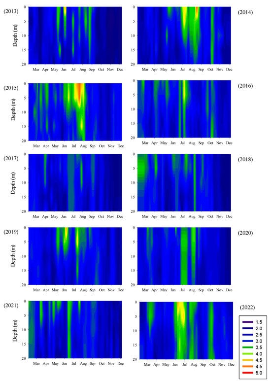 The air temperature, rainfall, discharge, and retention time of Paldang Lake over 10 years (2013–2022) are shown in Figure 3. Air temperature gradually increased from early summer, reaching a peak in late July or August. The annual average temperature ranged from 11.7 °C (2013) to 12.9 °C (2015, 2016), with an overall average of 12.4 °C. The highest summer temperature was recorded in 2019 (summer average: 26.0 °C).