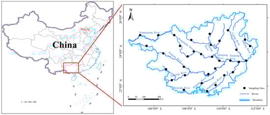 The Guangxi Zhuang Autonomous Region (hereinafter referred to as Guangxi) located in southern China (104°26′–112°03′ E, 20°54′–26°23′ N) has typical Karst landforms and Danxia landforms. The rivers in the area belong to four basins (the Pearl River Basin, the Yangtze River Basin, the Red River Basin, and the rivers flowing into the Beibu Gulf) and span three climatic zones: the northern tropics, the southern tropics, and the middle tropics [13]. Guangxi is one of the world’s biodiversity hotspots, one of the richest areas in terms of aquatic biodiversity, and an important production base for freshwater fisheries in China [14].