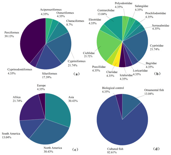 The 23 non-native fish species collected represent 7 orders, 13 families, and 20 genera (Table 1); the orders most represented were the Perciformes with nine species, Cypriniformes with five species, and Siluriformes with four species (Figure 2a); the families most represented were Cyprinidae with five species, Cichlidae with five species, and Centrarchidae with three species (Figure 2b). In terms of the places of native region, seven originated from Asia, seven from North America, five from Africa, and one from Europe (Figure 2c). In terms of the purpose of introduction, 19 species are used as cultured fish, three species are used as ornamental fish, and one is used for biological control (Figure 2d).