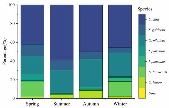 The percentage of non-native fish abundance in each season showed that C. zillii was dominant in each season, which was followed by O. niloticus (Figure 3). Summer has the highest number of non-native fish species with 21 species, which was followed by 20 species in winter with 18 species in spring but only 15 species in autumn. In addition, P. spathula and M. pellegrini were only collected in summer (Table 2).