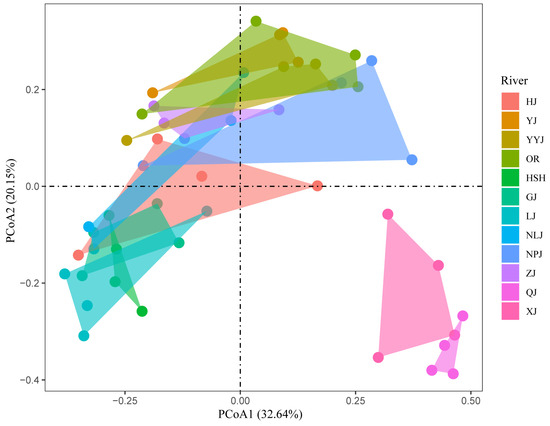 The following supporting information can be downloaded at: https://www.mdpi.com/article/10.3390/w16213062/s1, Table S1: The PERMANOVA result of the overall difference at all river system grouping levels; Table S2: The PERMANOVA result of the pairs of river systems.