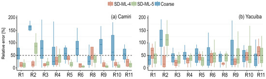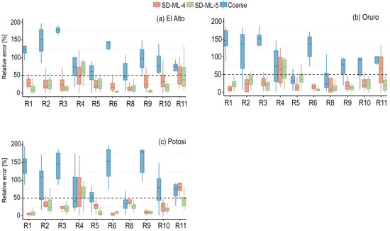 The GCMs generally showed good skill in this zone (Figure 4). The majority of the relative errors for the indicators were below 50%. Hence, the added value from the SDMs was more difficult to investigate, and sometimes there was none (raw GCM data had a similar skill or was a better predictor). However, looking at Figure 4 in detail, one can notice that the SDMs performed well in R8 by reducing the relative error of the GCMs to less than 25%. For the mentioned indicator, SD-ML-4 showed a better downscaling in Guayaramerin, Rurrenabaque, Trinidad, and Trompillo, and SD-ML-5 in Cobija. Regarding winter precipitation (R4), the results showed poor skill (no added value) in Cobija, Rurrenabaque, and Guayaramerin, while in Trinidad and Trompillo, SD-ML-4 obtained reliable downscaled results with a median relative error of around 25%. Except for Cobija, SD-ML-4 outperformed SD-ML-5 in R5 (maximum duration of dry spells). Interestingly, in Cobija, the opposite happened in R8 (10-year return period precipitation). In all cases of high precipitation occurrences (R9, R10, and R11), both methodologies reduced the median relative error to less than 50%.