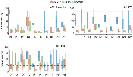 Figure 3 shows the relative errors in the stations of the Andean slopes. Again, similar patterns are seen in the relative errors of the coarse scale (raw GCM outputs), except for Cochabamba, in which the relative errors were larger than 200% for R2, R3, R4, and R6. In the mentioned indicators, the correction of the SDMs brought the indicators to less than 50% of relative error except for R4 (winter precipitation). However, despite the large relative error in R4, the added value of the methodologies was clear. Tarija station showed slightly different patterns, with a larger relative error and a larger interquartile range (more variability). Compared to Cochabamba and Sucre stations (where in most cases, the relative errors were below 25%), many indicators showed relative errors larger than 50%. The zone stations generally showed small relative errors (less than 50%) in R5 and R8, with smaller variability (smaller interquartile range) compared to the raw outputs except for SD-ML-5 for R8 in Tarija. This is important to emphasize since R5 and R8 denote the maximum duration of dry spells and the daily precipitation intensity for a 10-year return period, respectively, which were the most representative indicators for droughts and floods in this work.