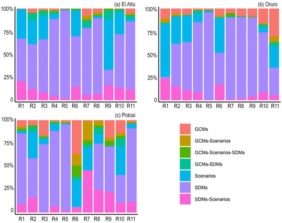In the highlands, the uncertainty share of the SDMs was dominant (Figure 6). The contribution from the GCMs rose in Oruro, especially for R10 and R11 (indicators of occurrences of high extreme events) to about 20.4% and 41.8%, respectively, but the contribution remained small compared to the SDMs. Moreover, the future scenarios were the second largest contributors.