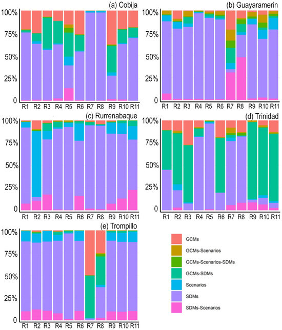 Compared to the highlands and Andean slopes, the Amazon lowlands contained a heterogeneous pattern (Figure 8). Although the SDMs had the highest uncertainty share in most cases, there were important contributions from the GCMs. Moreover, in some locations and indicators, the GCMs took over (e.g., R7 in Trompillo). Note that in Trinidad, the uncertainty share of the GCM–SDM interaction took over in most cases. The change in the pattern of the uncertainty contribution in Trinidad must be elaborated further as this increase in the interaction´s share could mean that in that zone, the use of a certain SDM method can give large differences in the results.