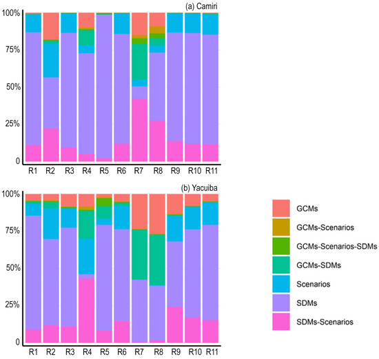 Uncertainty contribution from the different sources in the Amazon lowlands. Each color represents the individual contribution to the total variance by the GCMs, SDMs, SSPs (scenarios), and the different second- and third-term interactions. R1, R2, …, and R11 denote the research indicators (see Table 3).
