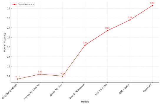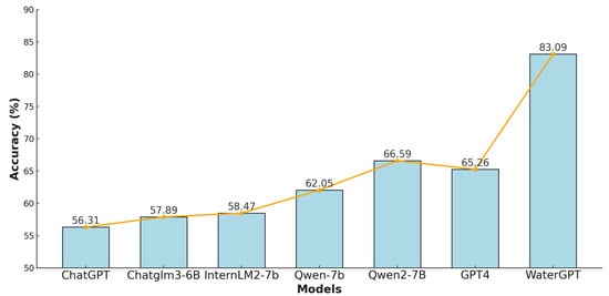 Additionally, based on an extensive corpus of hydrological knowledge, we collaborated with four hydrology experts and used the GPT-4-turbo model as an assistant to create a hydrology evaluation dataset called EvalWater. This dataset, which covers 21 domains and includes approximately 10,000 questions, is designed to comprehensively assess large language models’ knowledge and understanding in the field of hydrology. We used EvalWater, along with the general capability evaluation dataset Ceval [38], to evaluate models trained through different methods. The results showed that our model, trained through incremental pre-training and fine-tuning, achieved the highest accuracy on EvalWater at 83.09%, surpassing GPT-4 by 17.83 percentage points. On the Ceval dataset, WaterGPT’s general capabilities were only about eight percentage points lower than the original model.