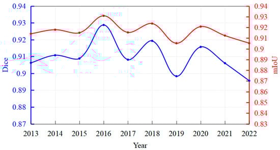 As shown in Figure 10, it can be seen that the Dice and mIoU metrics for each year exceeded 90%. From 2013 to 2022, the Dice and mIoU metrics remained relatively stable. This indicates that Water_Agent demonstrates strong robustness in water body extraction.