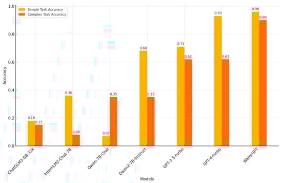As shown in Figure 12, the specially trained Water Agent demonstrates excellent performance on both simple and complex tasks. It achieved a 96% completion rate on simple tasks and a 90% completion rate on complex tasks, resulting in the highest overall accuracy of 93% among all the models.