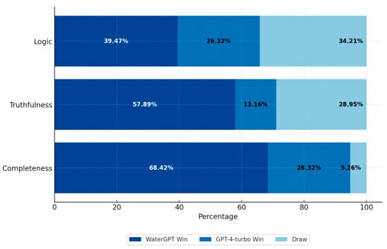 From the results above, it can be seen that our model achieved the highest accuracy in completeness, truthfulness, and logic. Specifically, the completeness score reached 8.76, the truthfulness score reached 9.39, and the logic score reached 9.18. To further compare the answer quality of our model with the current best-performing GPT-4-Turbo model, we used the ELO mechanism to evaluate the win-loss situation for each answer based on the scores. Specifically, we compared the win-loss results for 100 questions based on the answer scores of the two models. In each response, the model with the higher score was considered the winner. For example, if WaterGPT’s logic score was higher than GPT-4-Turbo’s in a particular response, WaterGPT was deemed the winner for logic in that case. Using this method, we conducted a detailed comparison of the 100 answers, and the results showed that WaterGPT received higher ratings 39.47% of the time in terms of logic, 57.89% of the time in terms of truthfulness, and 68.42% of the time in terms of completeness. The results are shown in Figure 15.