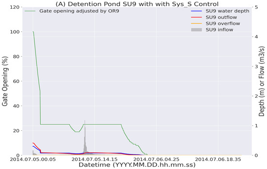 Interestingly, changes in water depth align with gate openings for only the first 36 h (5 July 12:00:00 to 6 July 24:00:00) despite a linear relationship between water depth and gate operation. Comparing Figure 2A,B, it becomes evident that outflow plays a more crucial role than other hydraulic factors (inflow, overflow, and water depth) in driving temporal changes in gate openings across control strategies. Similar results were observed for detention ponds SU4 and SU9, as shown in Figure 3 and Figure 4, respectively.