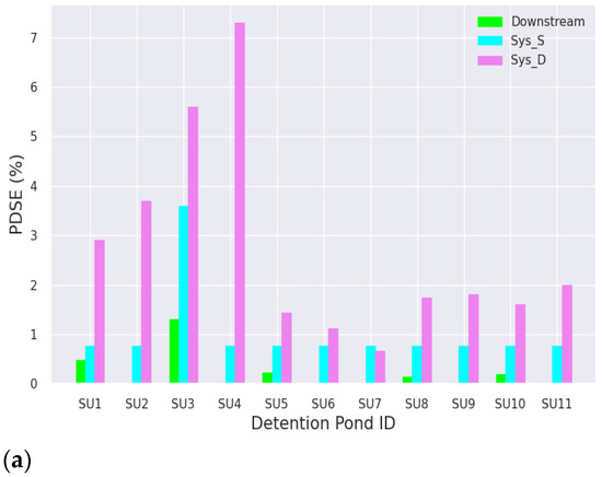 The ‘Downstream’ control strategy is the most effective at reducing downstream flooding compared to either system-level control approach. In contrast, the ‘Sys_D’ control consistently achieves the highest Percentage Depth Stress Elimination (PDSE), reaching up to 7% at SU4. The largest PDSE values at SU8 (5.1%) and SU10 (3.2%) are observed under the ‘Downstream’ control (Figure 7a). These differences in PDSE suggest that managing the most downstream gate significantly improves the reduction of water depth in the downstream detention ponds.