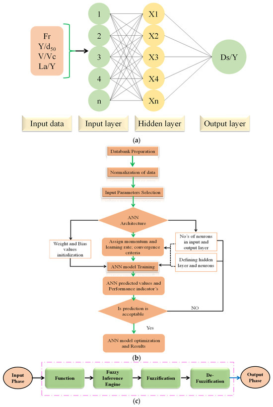 The framework and working phenomenon of the fuzzy inference system of ANFIS is depicted in Figure 3c. Various parameters can be predicted using a hybrid technique with BP and a least square system [38]. Previously, researchers incorporated ANFIS techniques for channel bed morphology to understand the system efficiency [39,40]. ANFIS proved to be the most important tool in a cross-domain for the prediction of continuous functions. ANFIS employed an if–then function with its fuzzy component to establish the relationship between the input and output parameters of the dataset. In the current investigation, the bell-shaped and trapezoidal-shaped functions have been employed. The bell-shaped function, also known as the gaussian function, is an integral part of ANFIS-based modeling of the membership functions of fuzzy sets. The name implies that it consists of a bell-shaped type of curve like a rounded hill and a peak in the middle that slopes slowly downward toward the sides. From the input data within a fuzzy set, the bell-shaped function adjusts parameters such as the mean and standard deviation to represent expressive variables and their uncertainties prominently. In contrast, the trapezoidal-shaped function is different from a bell-shaped function and offers more flexibility in defining the membership function. The trapezoidal function has two parallel lines connected through two alternate slope lines, and each parallel line represents the characteristic of the membership degree. Within varying degrees of membership, the trapezoidal-shaped function allows fuzzy sets in a broader range to handle the dataset’s more complex and diverse input–output relationship within ANFIS models.