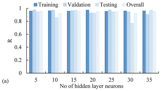 Figure 5a,b illustrate the outcomes of multiple DL-ANN models with varying numbers of neurons in the hidden layer of training functions. Out of these, Figure 5a displays R values for training, validating, and testing DL-ANN models, while Figure 5b–d depicts the MSE, MAE, and SSE values used for DL-ANN model training, validation, and testing. The seven DL-ANN models with varying numbers of neurons in a hidden layer that are displayed in these pictures differ from one another. In some circumstances, the R-values differ significantly between the DL-ANN models. Out of the first set of seven DL-ANN models for training, validation, testing, and overall, changing the number of neurons in the hidden layer of DL-ANN models, the minimum and maximum R-values are 0.92 and 0.96, respectively, with a difference of about 4%. The maximum R-value of the DL-ANN model with five neurons in the hidden layer for testing and overall is 0.95 and 0.96 with a difference of 1.2%, whereas the maximum value for the validation is 0.98. The maximum R-value of the DL-ANN model with five neurons is 0.96. These differences may be associated with the modeling technique, training function, and random data division for training, validation, and testing. Figure 5b shows the variability of MSE values across the training, testing, validation, and overall phases of seven DL-ANN models with various numbers of neurons in the hidden layer. The MSE means the error square between predicted and observed values. The results of the seven DL-ANN models indicate consistency across the different phases with a lower variation in errors, which suggests a good prediction across different datasets. The maximum and minimum values for seven various DL-ANN models with varying numbers of neurons in the hidden layer for the training, testing, validation, and overall are 0.0042, 0.0094, 0.0068, 0.0081 and 0.0023, 0.0021, 0.0021, 0.0034, respectively. Significant discrepancies exist between the maximum and minimum values for training, testing, validation, and overall. The lower MSE value for seven distinct DL-ANN models with varying numbers of neurons in the hidden layer indicates that the model is performing better. Also, the maximum and minimum numbers show that the model’s overall performance is satisfactory. Still, there is a significant drop in model accuracy due to the model overfitting the training data.
