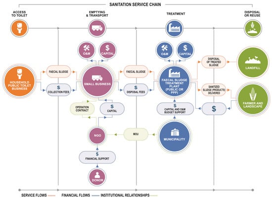 - Schoebitz, L.; Zurbrugg, C.; Niwagaba, C.; Nguyen, V.A.; Strande, L. Private Public Partnership Solutions for Faecal Sludge Management. Excreta Wastewater Manag. 2015, 16, 12–13. Available online: https://www.eawag.ch/fileadmin/Domain1/Abteilungen/sandec/publikationen/EWM/Sustainable_Implementation/private_public.pdf (accessed on 10 April 2023).