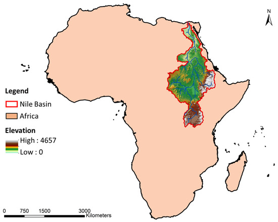Study area showing the Nile basin in Africa with its elevation and river hydrology.