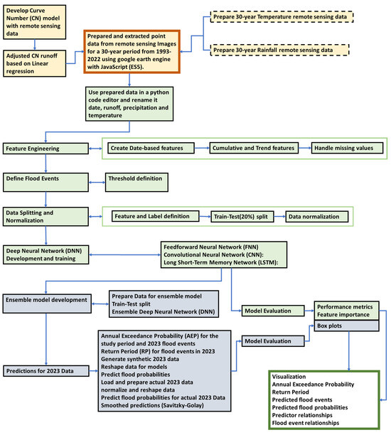 Hence, estimated runoff is used alongside other predictors to train three deep learning models: Feedforward Neural Network (FNN), Convolutional Neural Network (CNN), and Long Short-Term Memory (LSTM) to predict flood events. A deep neural network ensemble (DNNE) leverages synthetic data generated from historical predictor data and deep learning model results to forecast flood probabilities for the upcoming year. The relationship between discharge, return period and year is examined using the Gamma and log-normal methods, with Annual Exceedance Probabilities (AEP) considered at 5%, 1%, 0.1% and 0.01%. These AEP thresholds are crucial for identifying significant flood events with high return periods, which aligns with common practices in flood risk management, providing valuable insights for water resource planning and flood mitigation strategies [17].