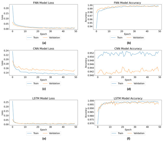FNN, CNN and LSTM model loss and accuracy during training and validation for flood event prediction for the 30-year period from 1993 to 2022. Subfigures (a,c,e) show model loss, while (b,d,f) display accuracy over 50 epochs. The curves highlight the models’ performance and generalization between training and validation sets.